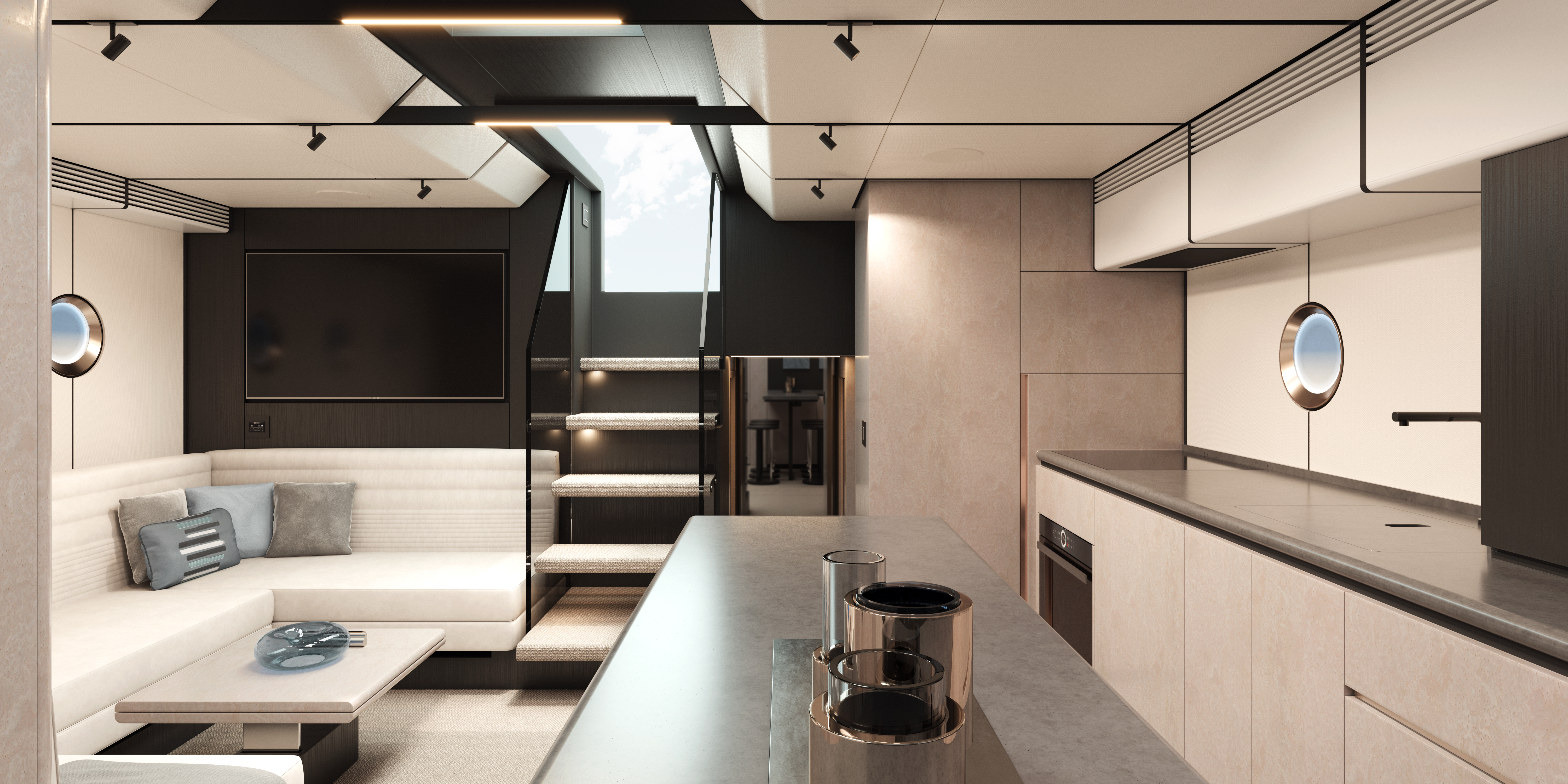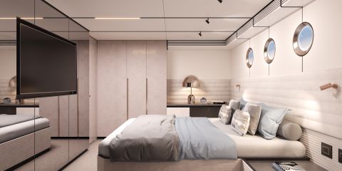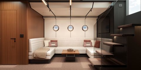 Sisätilat ovat BurdissoCapponi Yachts & Design -studion käsialaa. Suunnittelutoimisto on luonut visuaalisen kielen, jossa korostuvat materiaalivalinnat, väriyhdistelmien kontrastit ja hienostuneet pinnat. VanDutch 75:een on tarjolla kaksi eri sisustuskonfiguraatiota: Cool on vaalea ja moderni, yhdistäen helmiäisjuuriviilua, mattapintaista Slate Black -puuta ja beigeä mokkaverhoilua. Smooth puolestaan on lämpimämpi ja pehmeämpi kokonaisuus, jota hallitsevat punertava mahonki ja intiimit sävyt. Pisteitä ropisee sekä vaihtoehdoista että niiden lievästi 80-lukulaisilta kalskahtavista nimistä.