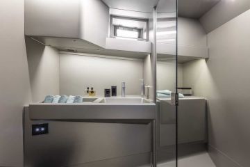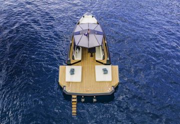 Perässä on molemmilla laidoilla vaakatasoon levittyvät laitaterassit ja aurinkopatjat. Peräpeilistä työntyy esiin syvät uimaportaat. Vesi on tällä privaattiterassilla vahvasti läsnä.