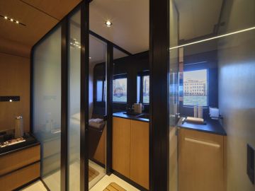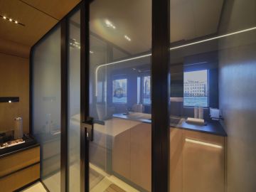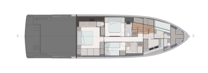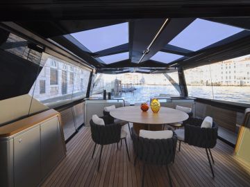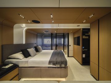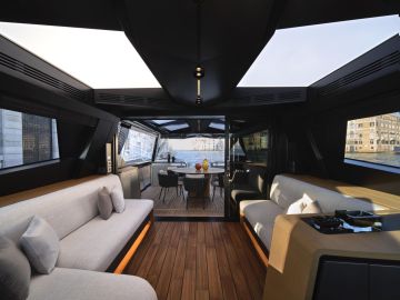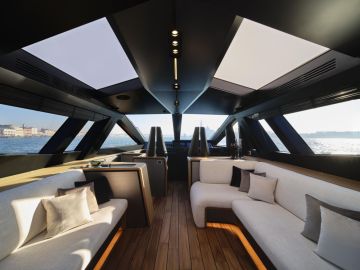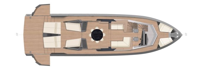 Ohjaamo on huomattavan edessä ja sen jatkeena stealth-muotoillun ylärakenteen suojassa on sisäsalonki, jonne voi vetäytyä seurustelemaan ilmastoinnin viileyteen. Koko pääkansi on kauttaaltaan yhdessä tasossa, mikä sekä helpottaa liikkumista että tekee tiloista avaran ja yhtenäisen tuntuisia.