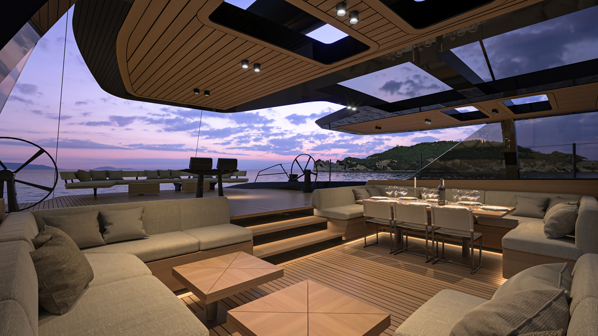 Pienemmässä, jos 130-jalkaista sellaiseksi voi kutsua, takakansi aukeaa tasaisena heti salongin jälkeen ja siinä on suuri oleskeluryhmä, jonka lisäksi tilaa jää vielä erilliselle takakannen uimatason auringonottoryhmälle. Suuremmassa 150-jalkaisessa on oleskeluryhmä ruorien yhteydessä ja suuri omistajan ulkosalonki lasketun takakannen yhteydessä, poissa vähempiarvoisten vieraiden silmistä.