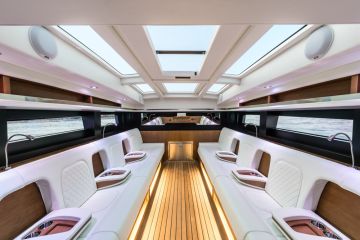 Plussan puolelle laskettakoon se, että veneessä on vakiona automaattinen sanitaatio, joka on oletettavasti tarpeellinen nykyisiä ja tulevia pandemioita ajatellen. Toinen miellyttävä ratkaisu ovat matkustamon pienet ikkunat ja istumajärjestely, jotka varmistavat minimaaliset virikkeet ulkomaailmasta yhteysmatkan aikana. Vene tarjoaa siis ainutlaatuisen tilaisuuden viettää aikaa omiensa parissa. Matkustamon kattoa saa toki kohotettua sähköisesti, mikä helpottaa sisäänkulkua ja paikoilleen asettumista.