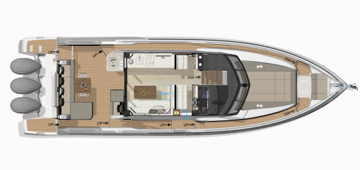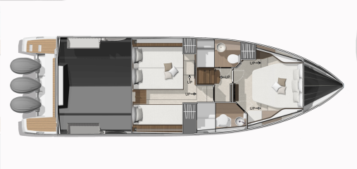 Rungon lisäksi myös majoituskannen tilaratkaisu on konsernisisarissa identtinen. Se muodostuu kolmen vuoteen keskikajuutasta, keulaan sijoitetusta parivuoteella ja omalla toiletilla varustetusta omistajansviitistä sekä erillisestä päivätoiletista, joka sekin on varustettu suihkukomerolla. Yhtäläisyydet jatkuvat peräpeilissä, jonne on molemmissa ripustettu kolme perämoottoria. Tarjolla on 3 x 300 tai 3 x 350 hevosvoimaa eli tuhannen raja saadaan rikki.