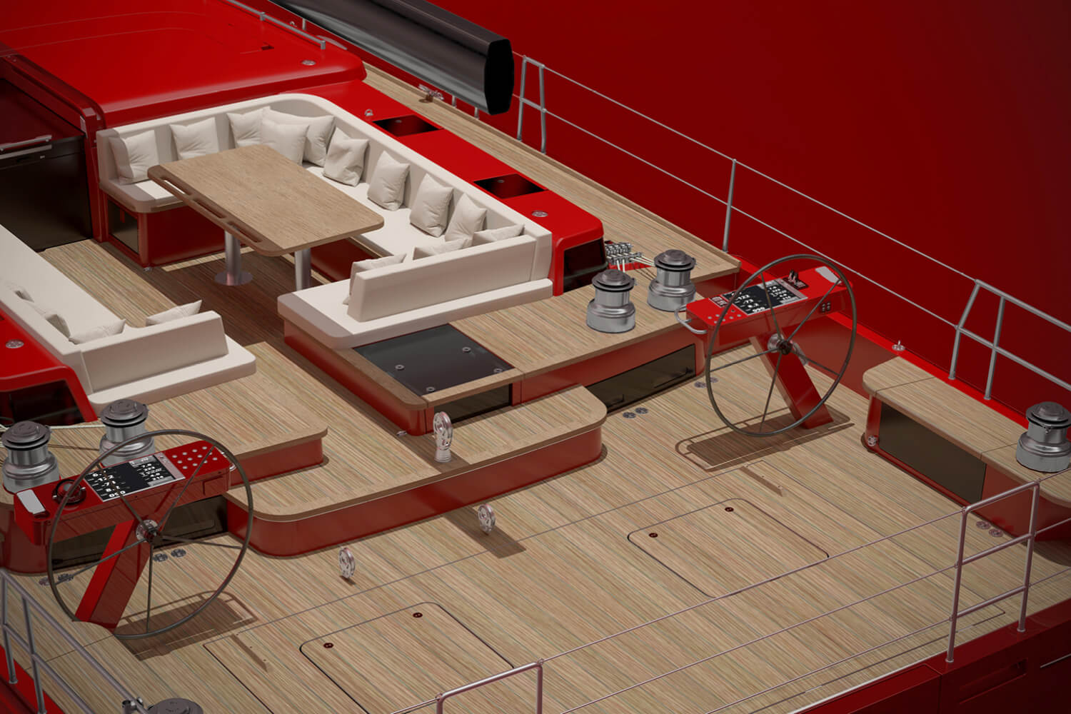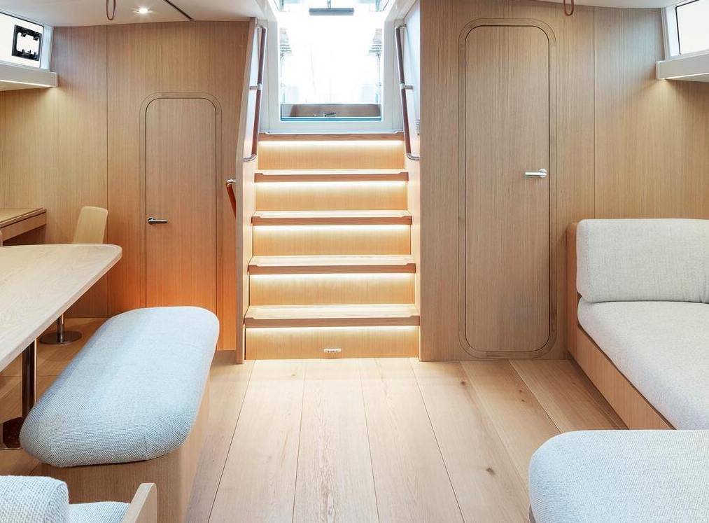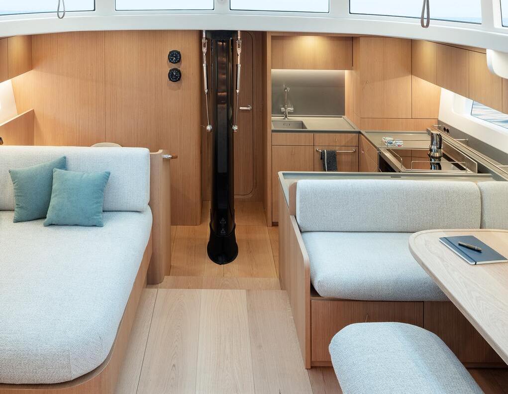 Kannella uusia ideoita on sovellettu matkustamoon ja ohjaamoon. Edellinen on tehty epäsymmetriseksi niin, että styyrpuurin on varattu todella suuri U-sohvaryhmä pöytineen. Pääkulkutie perään on keskilinjasta vasemmalle vieressään pitkä L-sohva. Molempien sohvien peräpäädyt voi laskea aurinkotasoiksi.