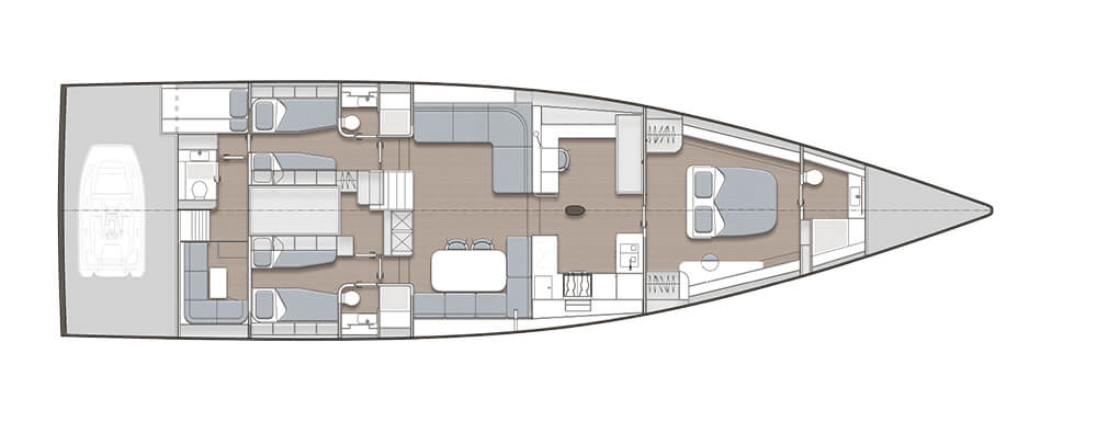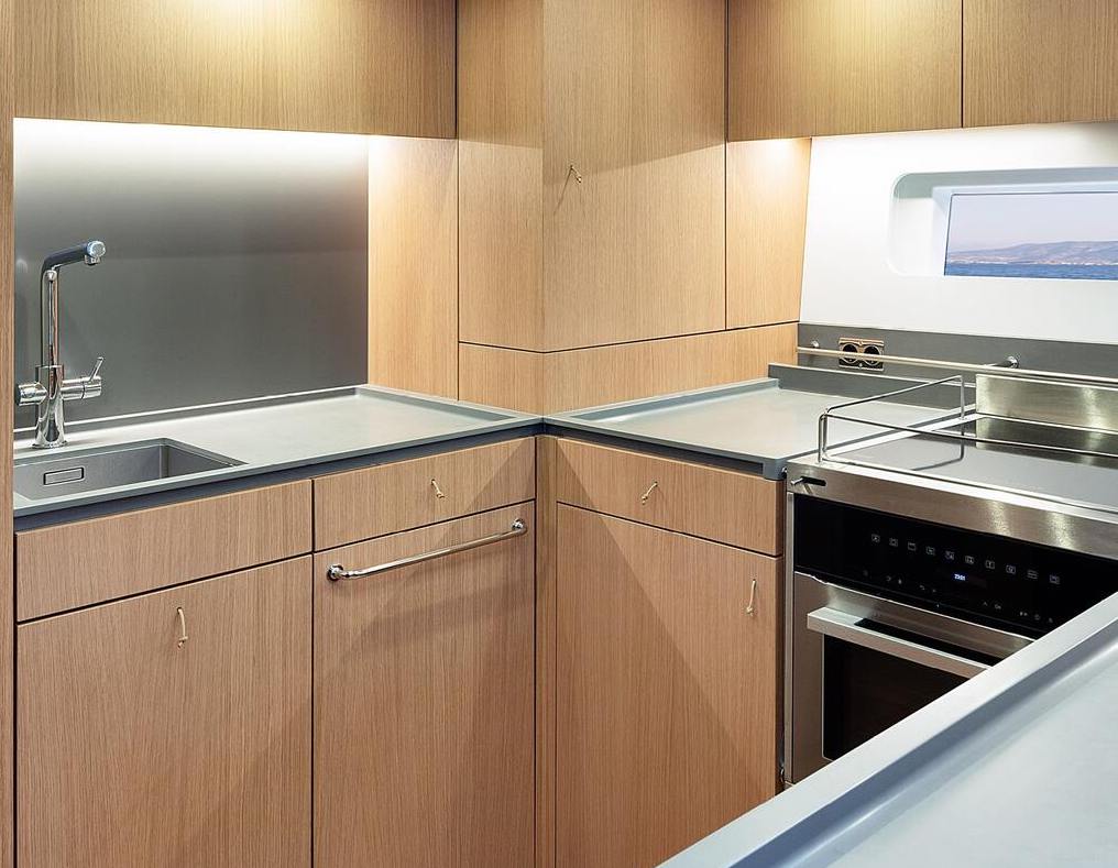 Maston kohdalle sijoittuvaan tilaan saa joko yhdistetyn keittiön ja ruokailutilan, tai keittiön muiden kodinhoitolaitteiden kanssa. Silloin ruokailu siirtyy salonkiin, joka portaikon keulanpuolella ulottuu koko veneen poikki jakautuen kummallakin laidalla oleviin sohva- ja oleskeluryhmiin.