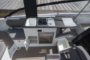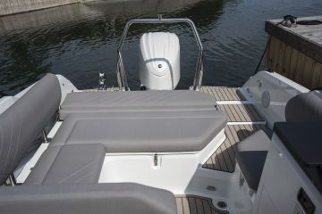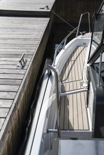 Keulan lisäksi myös peräkannelle ja pitkälle moottorin sivuille ulottuville uimatasoille on selkeä kulkureitti. Pintapehmeä Softdeck-turkkipinnoite kuuluu vakiovarustukseen ja avotilan kuomulle on väljäksi mainittu kuomutalli.