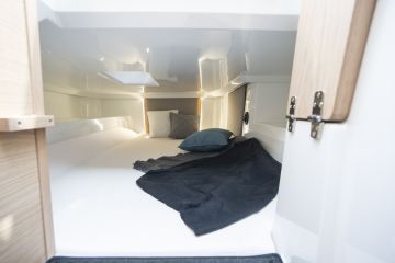 Keulakannen alla on kajuutta, joka vaikuttaa suurten ikkunoiden ansiosta avaralta. Paapuurin puolelta kkulkusyvennyksen alta on löytynyt tila mukavan oloiselle divaanille, jonka vieressä olevasta runkoikkunasta aukeaa muikeat merimaisemat. Keulapiikissä on parivuode ja styyrpuurin laidalla erillinen, sähkötoimisella vesi-wc:llä varustettu toiletti. Lisäksi kajuutan portaikon takaa työntyy avotilan alle veneen keskilinjalle pituussuuntaan asemoitu toinen parivuode.