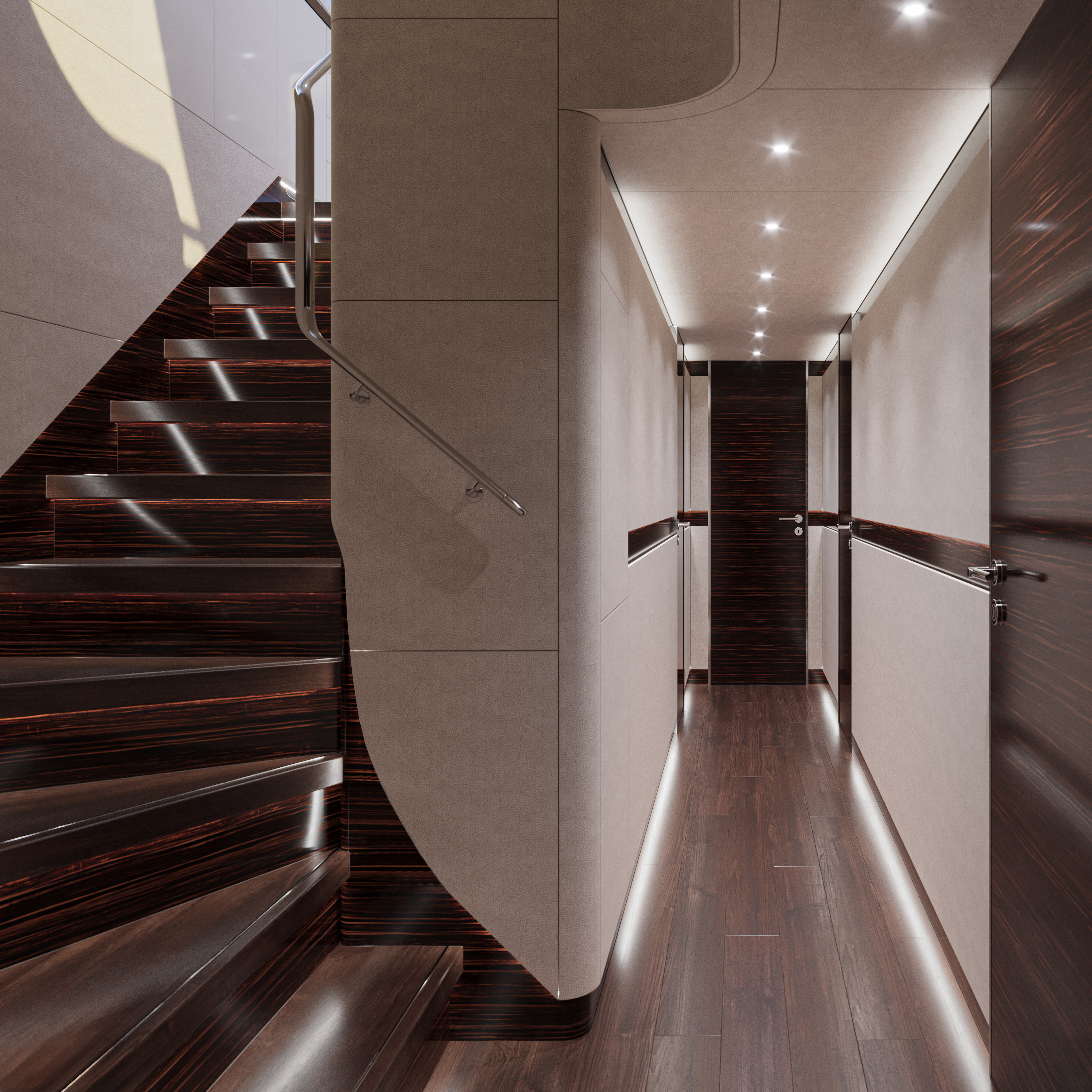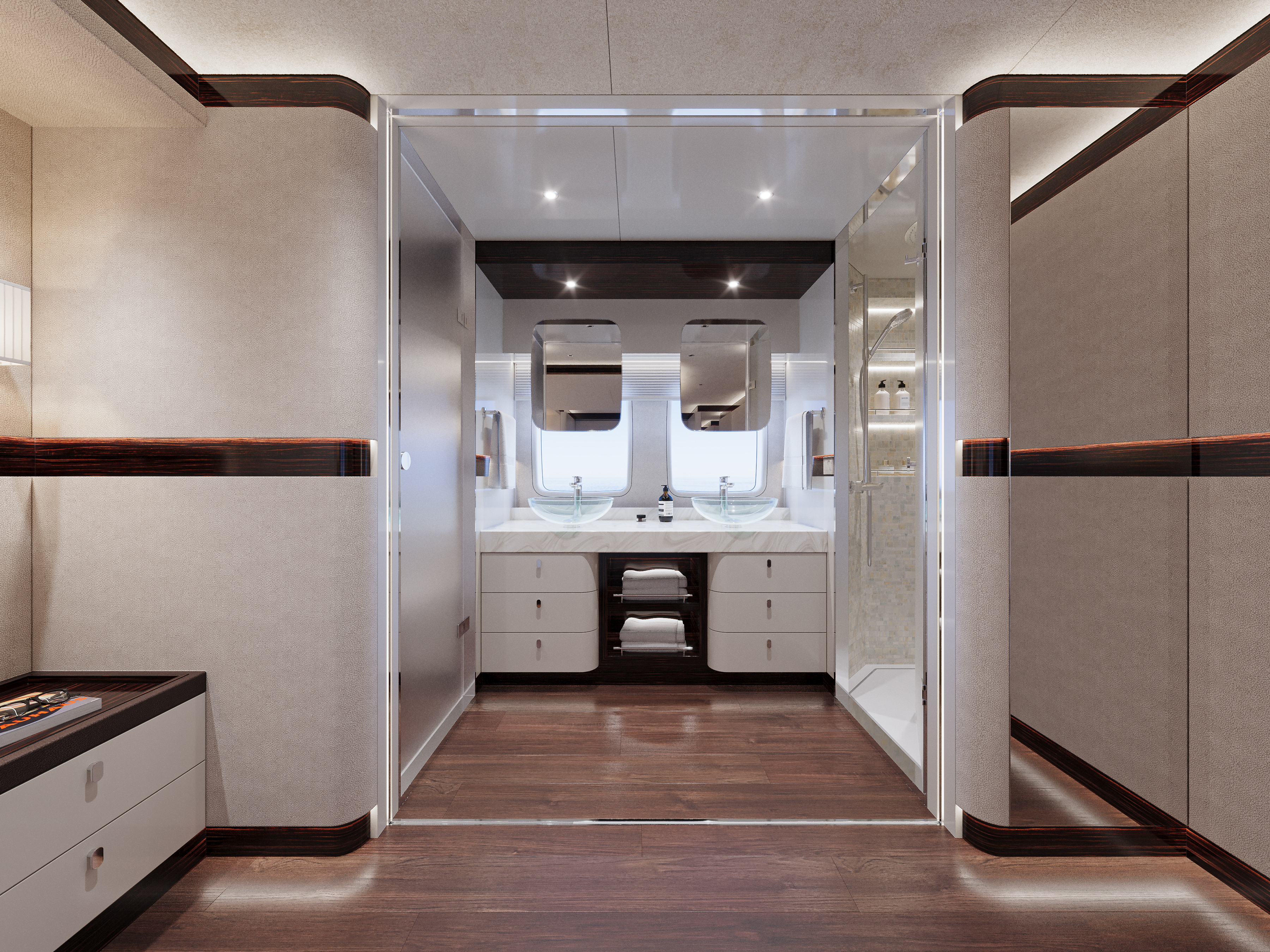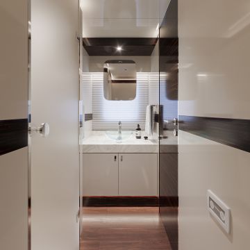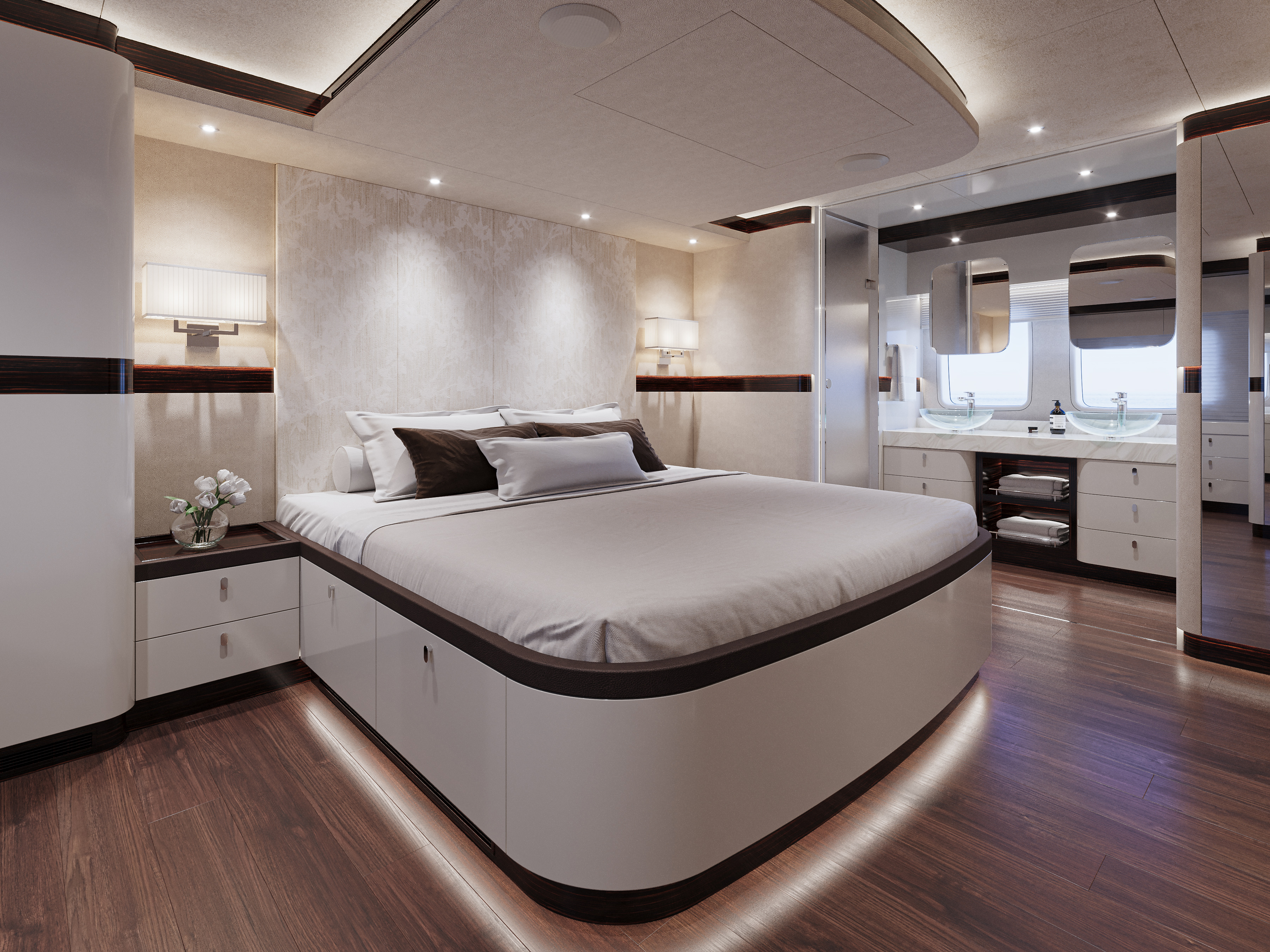 Minimalistisen hienovarainen sisustusfilosofia jatkuu alakannella, johon kuljetaan leveitä portaita pitkin. Alakannen pohjapiirrustusta hallitsee omistajan hytti, jonka sisustus koostuu pelkistetyistä ja modernin muodikkaista kalusteista. Omistajan hytissä on luonnollisesti seisomakorkeus ja king-size-vuode. Vierashytit jatkavat samaa sisustuslinjaa, yhdistellen eri valkoisen sävyjä ja eebenpuuta, ja niissä on queen-size-vuoteet.