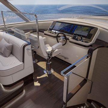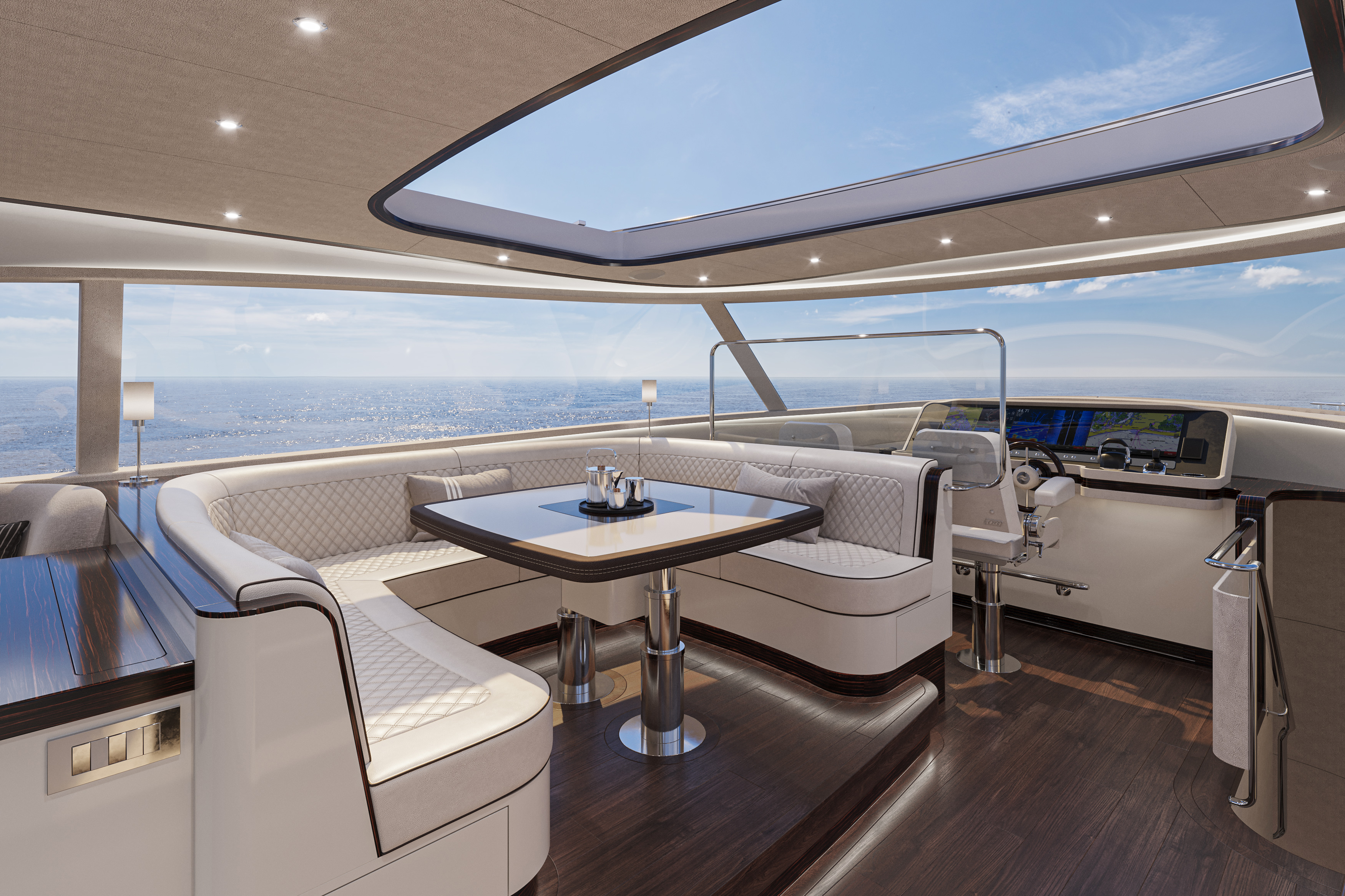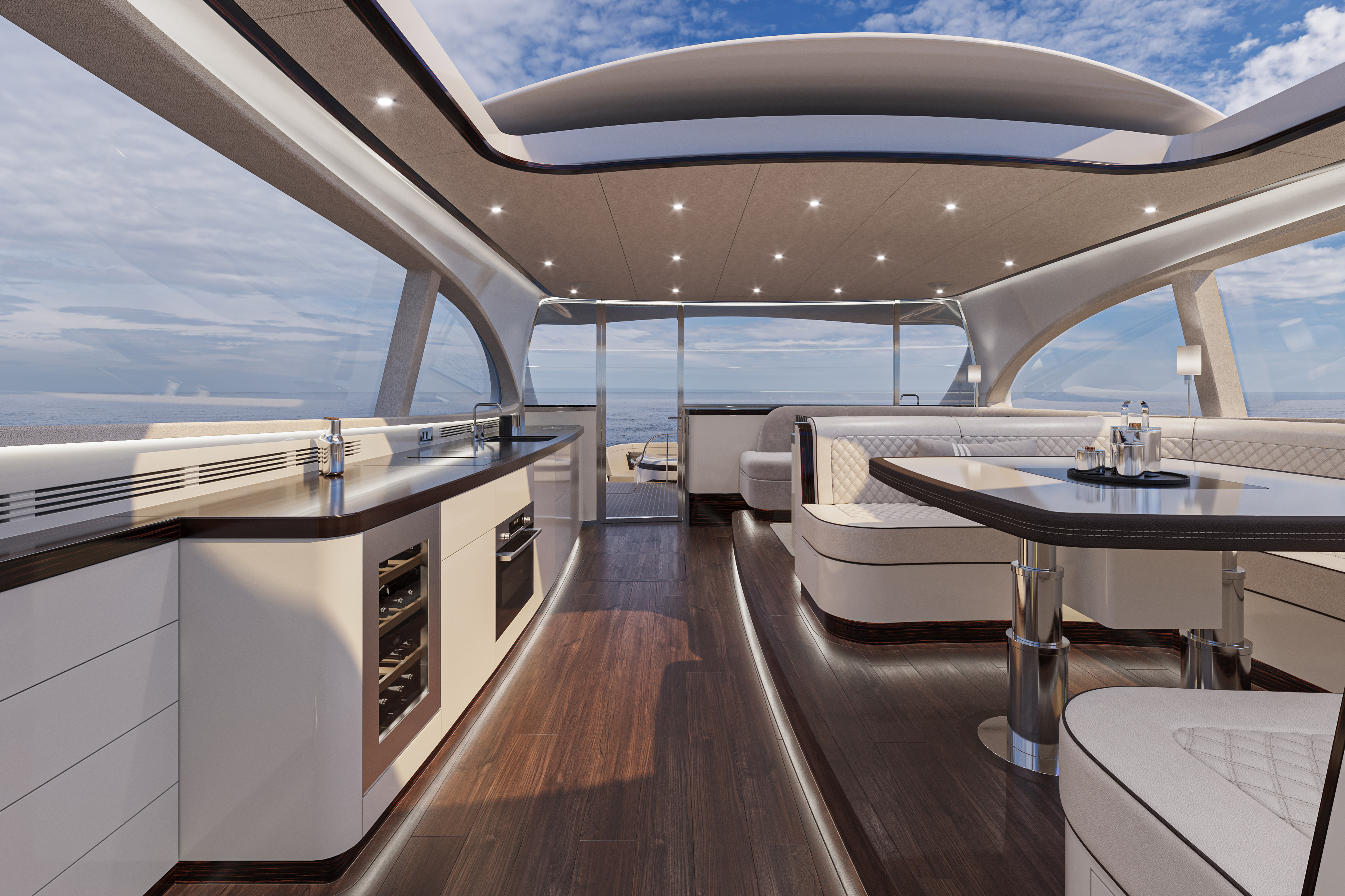 Salonki on renderöintien perusteella erittäin valoisa, sillä tilaa reunustavat isot ikkunat, suuri avattava aurinkokatto ja perälaipio on myös kokonaan lasia. Vaaleat tekstiilit ja kalusteet lisäävät ilmavaa tunnelmaa entisestään.