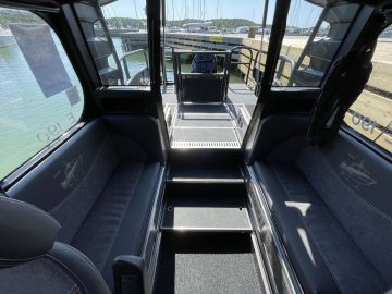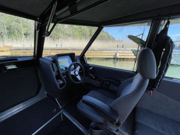 Kuskin ja kartturin paikoilla viihtyy muutenkin erinomaisesti. Niskatuellinen ja kyynärnojallinen istuin on työkonetasoa ja ergonomia kohdillaan. Keinonahkaverhoiltu kojelauta on melko tiivis sovitus, mutta kaikki päähallintalaitteet ovat loppujen lopuksi hyvin käsillä. Ahtaimmassa rakosessa on lisävarusteena saatavan keulapotkurin sauva.
