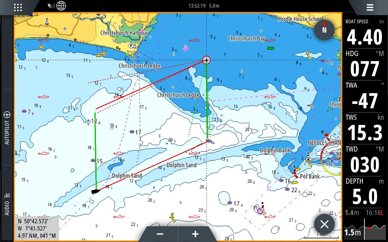 B&G-järjestelmä tarjoaa dataa purjehtijalle juuri siinä muodossa ja määrässä, kuin kulloinkin tarvitaan. Tässä Zeus-näytölle on valittuna laylines-viivat, jotka näyttävät ihanteellisen reitin purjehdittaessa merkille. Järjestelmä laskee viivat ottaen huomioon tuulen suunnan, veneen nopeuden ja jopa virran vaikutukset. Tämän perusteella se näyttää parhaan kurssin ja optimaalisen paikan vendalle tai jiipille, ottaen huomioon veneen suoritusarvot.
