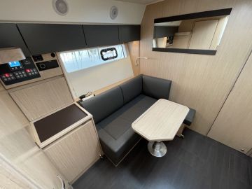 Varsinainen avotilan U-sohva alkaa poikittaisena takasohvana ja taittuu paapuuri laitaa pitkin kohti keulaa, ja on jättikokoinen. Sohvalle mahtuu hyvin istumaan kahdeksankin henkilöä. U-sohvan etupäädyssä on kompakti mutta käyttökelpoinen, katse ajosuuntaan istuttava apukuskinpaikka, joka toisin saisi olla korkeammalla. Sen vieressä on ylös sivuikkunan tasalle nostettu loikoilutaso, joka selkänojallisena osoittautui yllättävän rennoksi matkustuspaikaksi.