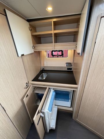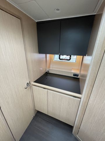 Tilavan, mukavan ja monipuolisen oleskelutilan kruunaa styyrpuurin laidalla oleva tilava pentterikaappi, johon kuuluu kaksi kookasta vetolaatikkoa, 80-litrainen jääkaappi, iso pesuallas sekä kaksiliekkinen liesi, jonka voi korvata grillillä. Molemmat voi valita joko sähkö- tai kaasukäyttöisenä.