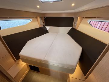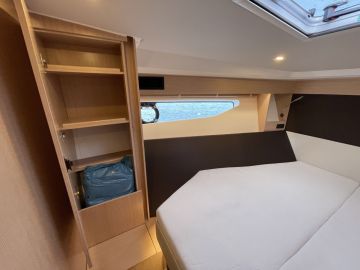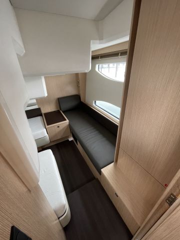 Pienemmissäkin tilaratkaisuissa on muutamia vaihtoehtoja. Esimerkiksi taka-avotilaan saa joko kiinteän aurinkotason muodostavan säilytystilalaatikon tai säädettävän pöydän, jolloin perään muodostuu uimatasolle avautuva U-sohvallinen oleskelutila, jonka toki saa pedattua myös aurinkotasoksi. Kannen alla keskikajuutta ja toiletti ovat aina oven takana, mutta keulakajuutan ja sisäsalongin välinen ovi ja laipio tulevat vasta optiona.