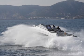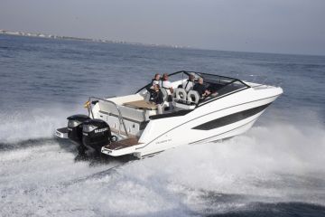 Suorituskyvystä homma ei jää kiinni, sillä tuplapotkureilla varustetut 350-hevosvoimaiset Suzukit siivittävät Flyerin yli 40 solmun huippunopeuteen. Kiihtyvyys on rivakkaa, mutta sivistynyttä. Tunnelma on vähän vastaava kuin isolla ja tehokkaalla katumaasturilla maantiellä kiihdytellessä. Mittarin viisarin mukaan tapahtuu ja selkäkin painautuu penkkiin, mutta malmikasa liikkuu pikemminkin eleettömästi kuin räjähtävästi.