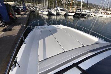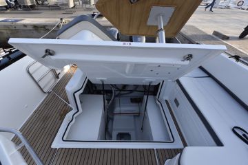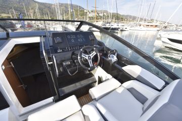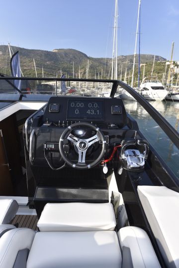 Sähkötehostettu hydrauliohjaus on kaikissa tilanteissa mukavan kevyt mutta silti tunnokas, joten rivakammatkin ohjausliikkeet suorittaa vaivatta. Vene reagoi niihin nöyrästi ja suhteellisen välittömästi.