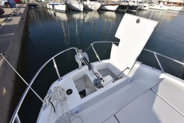 Flyerin edut pääsevät paremmin esiin, kun päivä paistaa. Keulakannella on iso ja tasainen loikoilusaareke, jonne pääsee kulkemaan helposti ja turvallisesti paapuurin laidalle avautuvaa kulkuväylää pitkin.