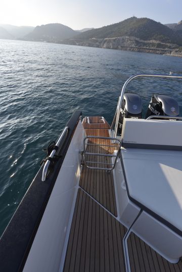 Peräkannella on hyvin tilaa liikkua, vaikka perämoottorit ottavat keskeltä osansa. Moottorien sivuille ulottuvat lisäuimatasot ovat lisävaruste, mutta ne kannattaa ruksata ilman muuta mukaan.
