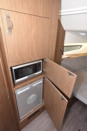 Perinteiseen sportcruiserin tilatarjontaan eron tekee oikeastaan vain sisäpentterin puuttuminen. Sen tilalla on kaapisto, joka kätkee sisäänsä jääkaapin ja mikroaaltouunin, joten lähinnä puuttuu vain tiskipöytä ja työtaso.