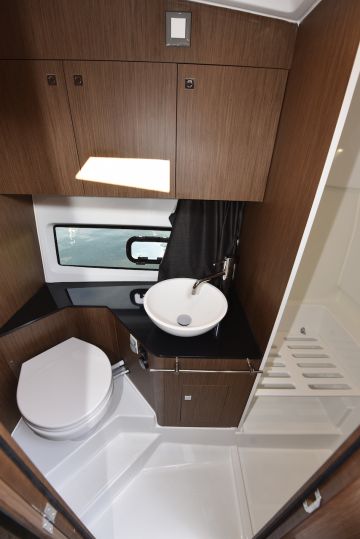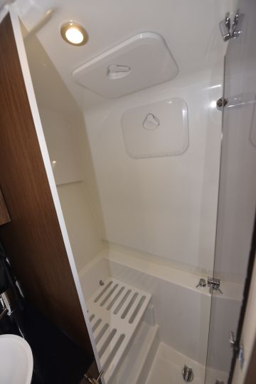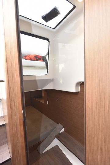 Sisätilojen suurin yllätys on kuitenkin kokonsa puolesta monet 40-jalkaiset matkaveneetkin kateelliseksi saava toiletti. Flyerissa se muodostuu tilavasta wc:stä sekä sen jatkeena olevasta suihkukomerosta. Kymmenen metrin kokoluokassa jo jako kuiva- ja märkätiloihin on ekstraa, johon monesti liittyy kompromissi, jossa wc-istuin on sijoitettu märkätiloihin eli suihkun puolelle. Flyerissa kyseinen kompromissi on vältetty.