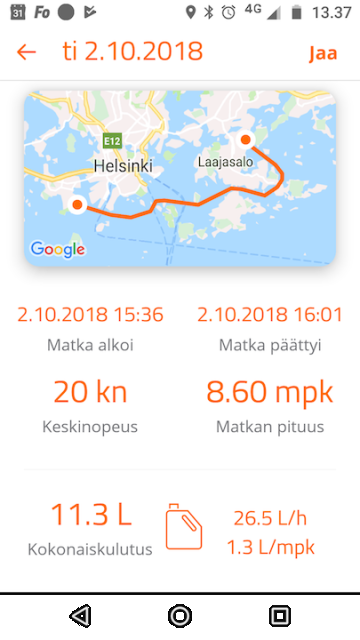 Apin lokitiedoista löytyvät veneen nopeus ja ajotietokoneen laskemat tiedot polttoainetaloudesta.