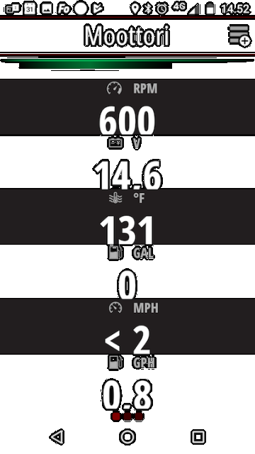 Moottorin tiedot appi sivuuttaa melkein kokonaan. Mukana on vain akkujen jännite ja polttoainetaso, jotka ovat tallentuneet silloin kun Buster Q oli viimeksi päällä.