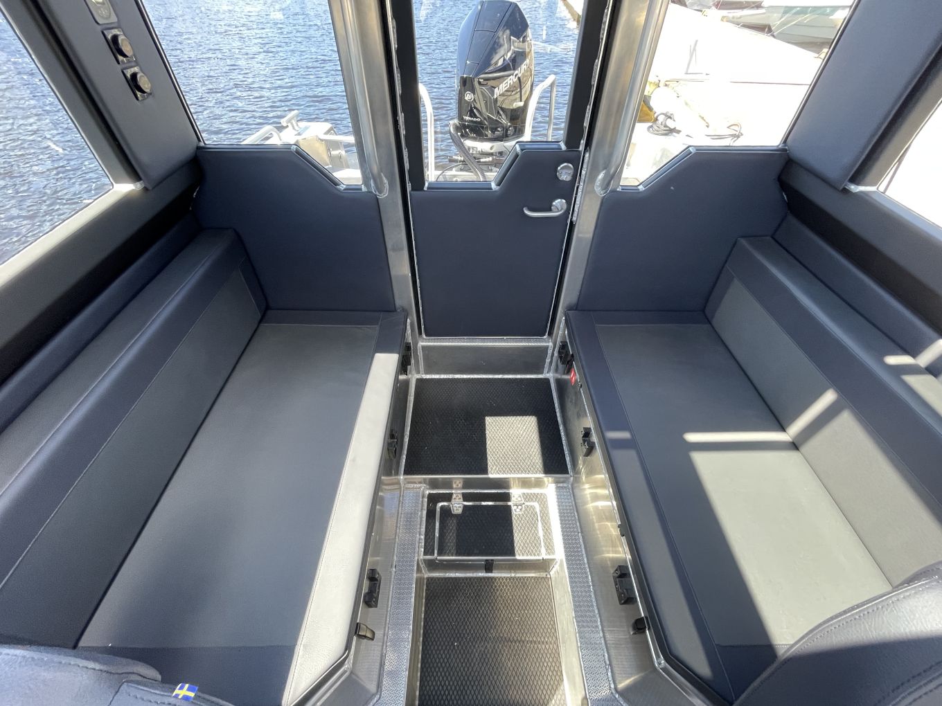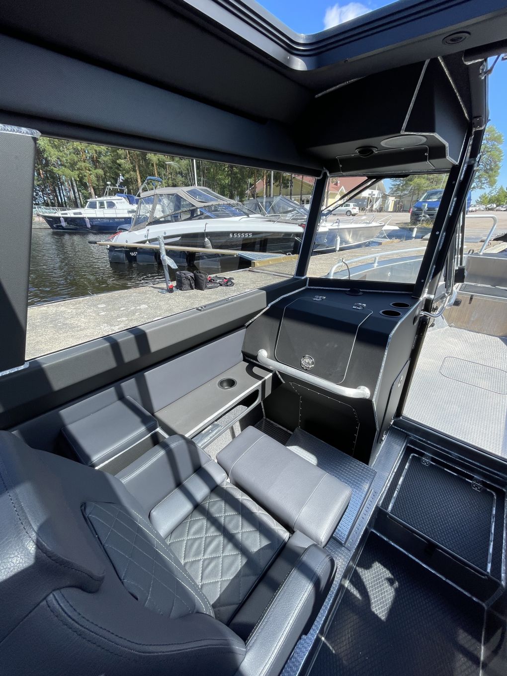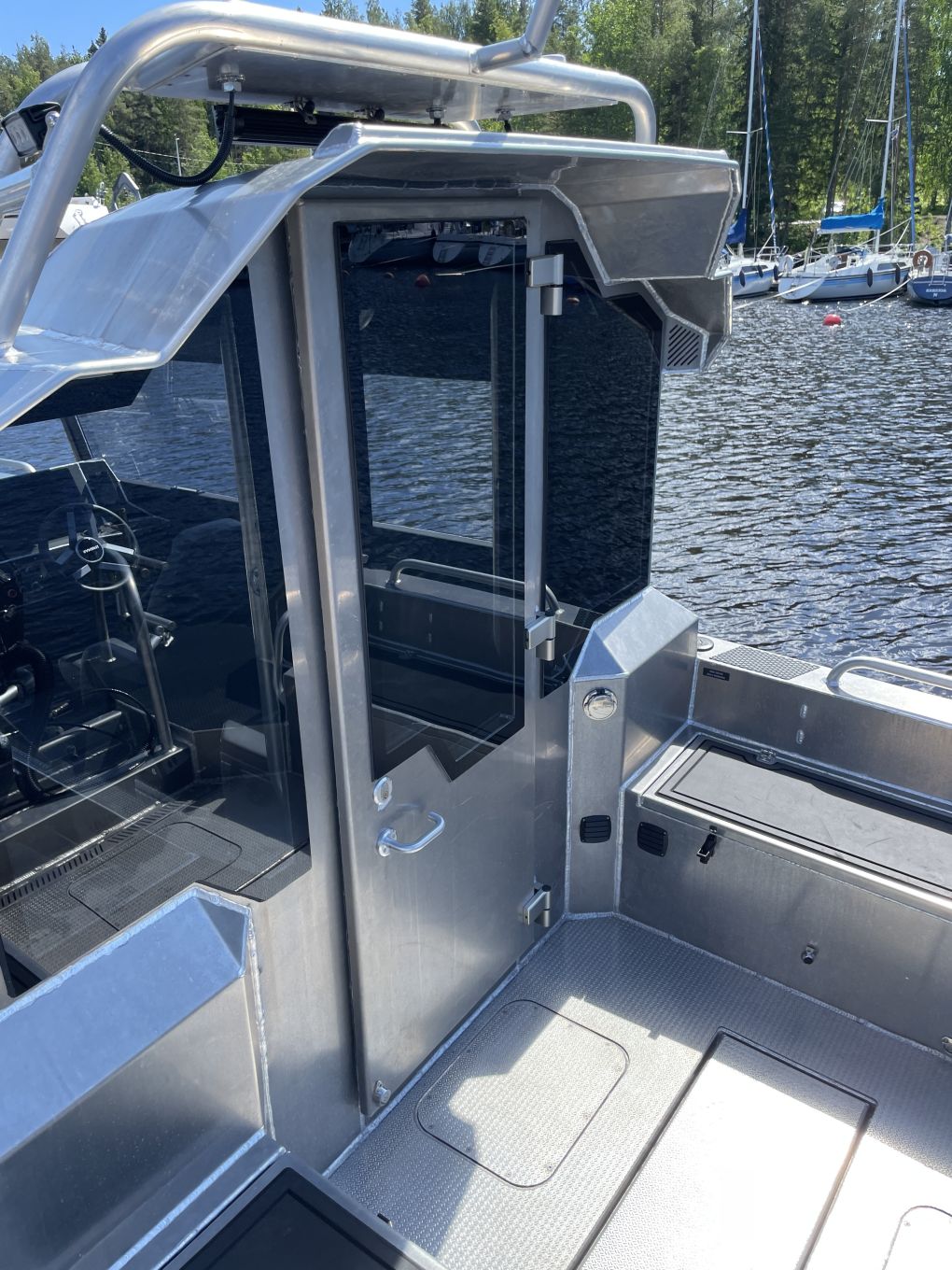 Paljaan alumiinisen ohjaushyttiveneen ilme on jylhä. Kookkaat liimalasit antavat Lynxmar C26:n hytille nykyaikaisen olemuksen.