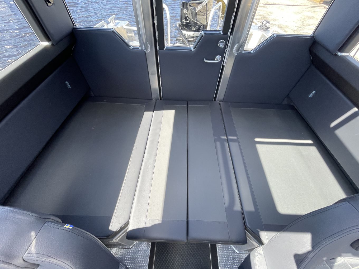 Päiväkäytössä C26:n hytti on mukavan avara. Siitä pitävät huolen korkeat ikkunat ja vakiovarusteisiin kuuluva lasikattoluukku. Kiva yksityiskohta on takaseinän ja -oven ikkunat, joiden vyötärölinja on sivuikkunoita alempana. Hyöty on siinä, että kuskin paikalta on hyvä näköyhteys aivan veneen peräkulmiinkin.