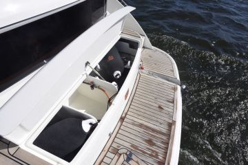 Helpoin tie veneeseen onkin uimatason kautta. Uimatasolla on kookas säilytystilalaatikko, joka toimii myös mainiosti penkkinä. Lokeroissa on tilaa ankkuripelille, köysille ja isoillekin lepuuttimille.