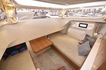 Oleskelu- ja matkustustilat on keskitetty makuukajuuttojen väliin. Koko paapuurin laita on varattu kookkaalle ja mukavalle u-sohvalle, jonka etupääty taittuu ajomatkan ajaksi ylös kahden istuttavaksi kartturin paikaksi.