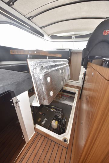 Perinteisten takakajuuttaveneiden tyyliin 320 ACC:ssä on sisämoottori ja akseliveto. Konehuone on keskellä venettä, ja luukun avaaminen ja koneeseen käsiksi pääsy on himpun haastavaa. Koeajoveneeseen valittu 320-hevosvoimainen Yanmarin V8-diesel käy nätisti ja äänieristys on onnistunut siihen nähden hyvin, että moottori murisee aivan matkustamon alla. Melutaso ei nouse edes huippunopeudella yli 80 desibeliin.