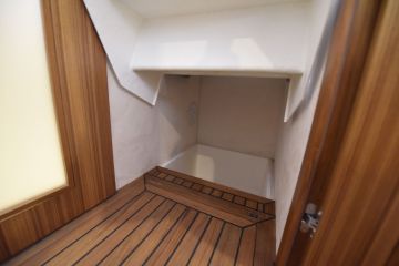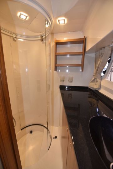 Toiletti on keulassa styyrpuurin laidalla. Se lienee kooltaan suurimpia mitä alle kymmenen metriä pitkään veneeseen on saatu mahtumaan. Harvan 40-jalkaisessakaan toiletissa on pyöreää suihkukaappia ja niin paljon vapaata lattiapinta-alaa kuin Marexissa. Takakajuutan asukkaiden kannalta toiletissa on vain yksi vika, etäisyys.