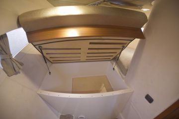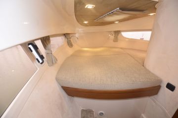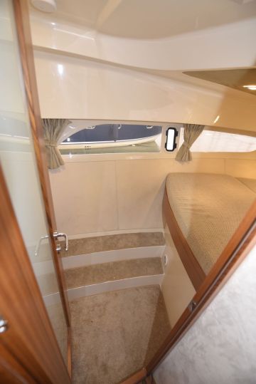 Toinen makuukajuutta on aivan veneen vastakkaisessa päässä eli keulassa, joten nukkumisrauha ja yksityisyys on maksimaalista. Keulakajuuttaa astutaan poikkeuksellisesti paapuurin sivulle avautuvasta ovesta. 2,1 metriä korkeassa eteistilassa mahtuu hyvin sekä pukeutumaan että tonkimaan kiitettävän kokoisia säilytystiloja. Vuode on nostettu korkealle ja tilaa riittää kahden aikuisen lisäksi myös lapselle.