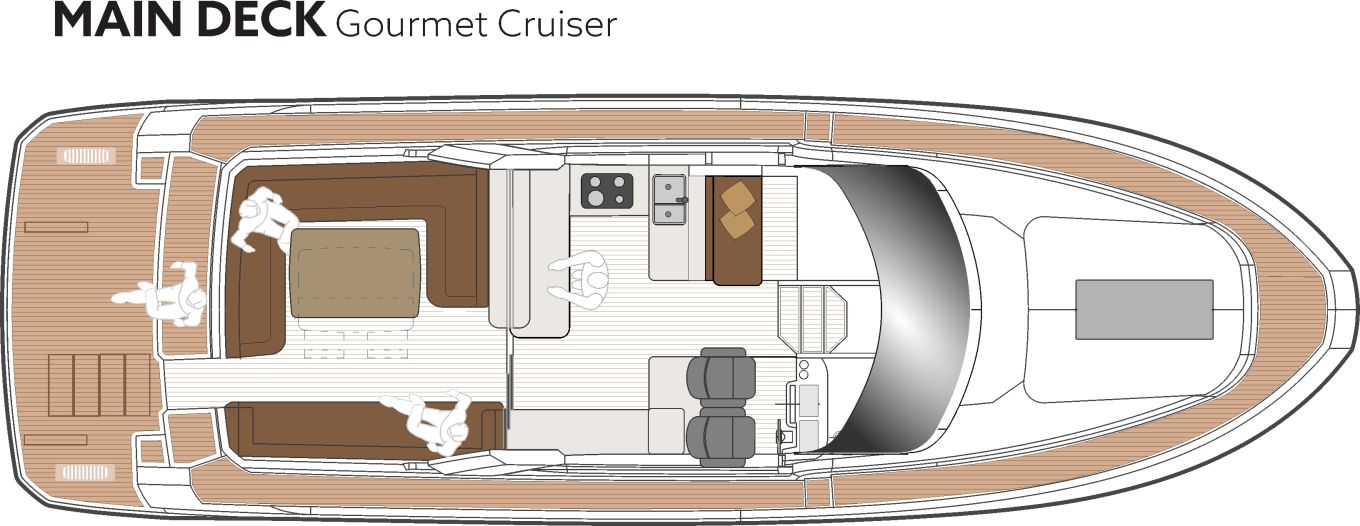 Gourmet Cruiserin kohdalla kenties ainoa kysymysmerkki onkin avotilassa sijaisteva oleskelu- ja ruokailutila. Avotilan saa toki Marexmaiseen tapaan suljettua kuomulla – ja vieläpä hyvin helposti.