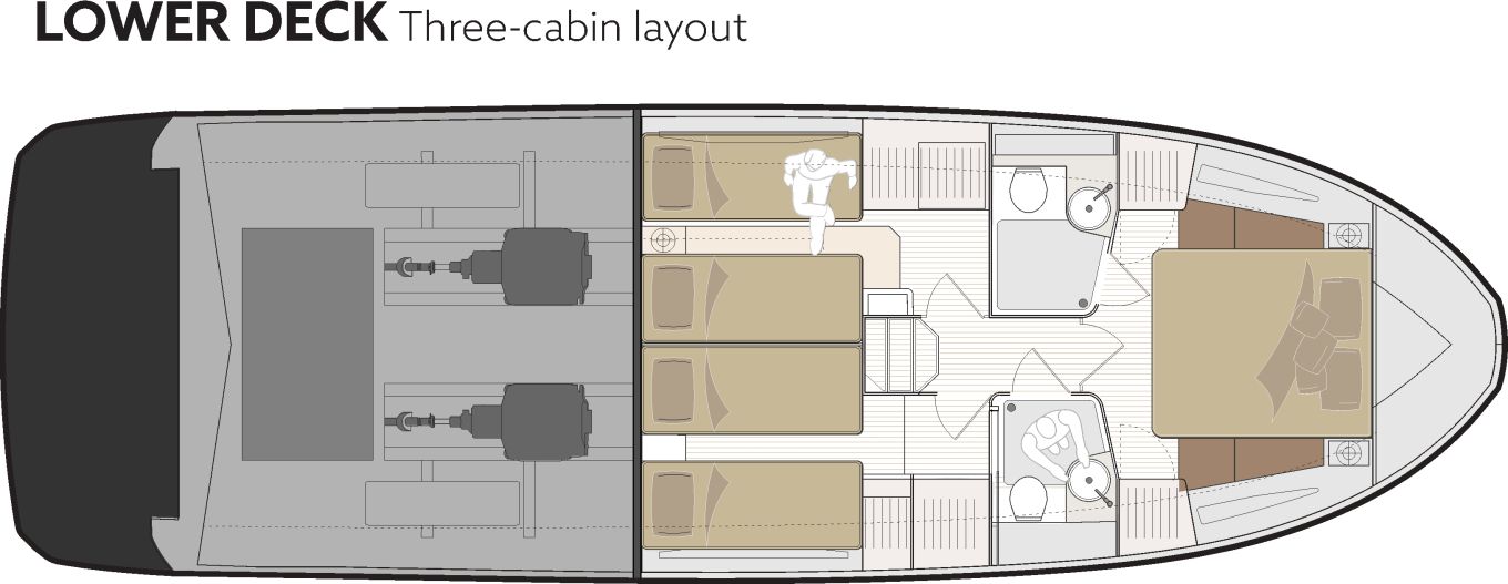 Majoituskannelle on tarjolla kahden tai kolmen makuukajuutan vaihtoehdot. Toiletteja on aina kaksi, mutta makuukajuuttojen lukumäärällä on vaikutusta niiden kokoon. Koeajoveneessä on kolme kajuutan tilaratkaisu.