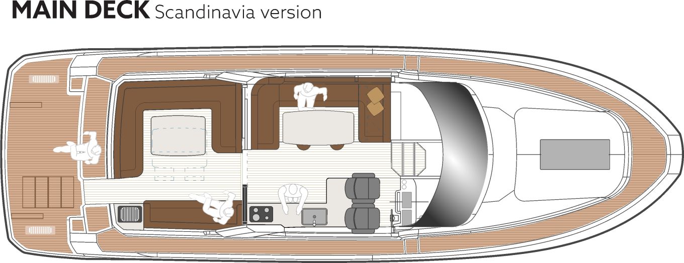 Avotilassa oleskelulle on kuitenkin vaihtoehto, ja sen nimi on Scandinavia Cruiser. Siinä jättipentteri pienenee normaaliin kokoon ja paikkaan ohjaamon jatkeeksi styyrpuurin laidalle, ja paapuurin puolelle saadaan u-sohva pöytineen. Sen myötä oleskelu- ja ruokailutilaa on sekä ulkona että kovien seinien sisällä niin sanotuksi kansisalongiksi asti.