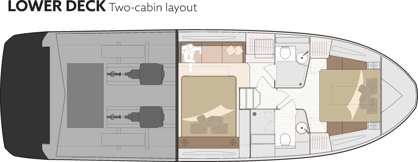 Kahden kajuutan versiossa hyödynnetään samaa keulakajuuttaa ja toiletteja, mutta laajennettuina: kajuutan ovi siirtyy käytävällä taaksepäin, jolloin styyrpuurin toiletin sisäänkäynti jää keulakajuutan oven ja laipion sisäpuolelle. Myös toiletti laajenee perän suuntaan reilun kokoisen suihkuhuoneen verran.