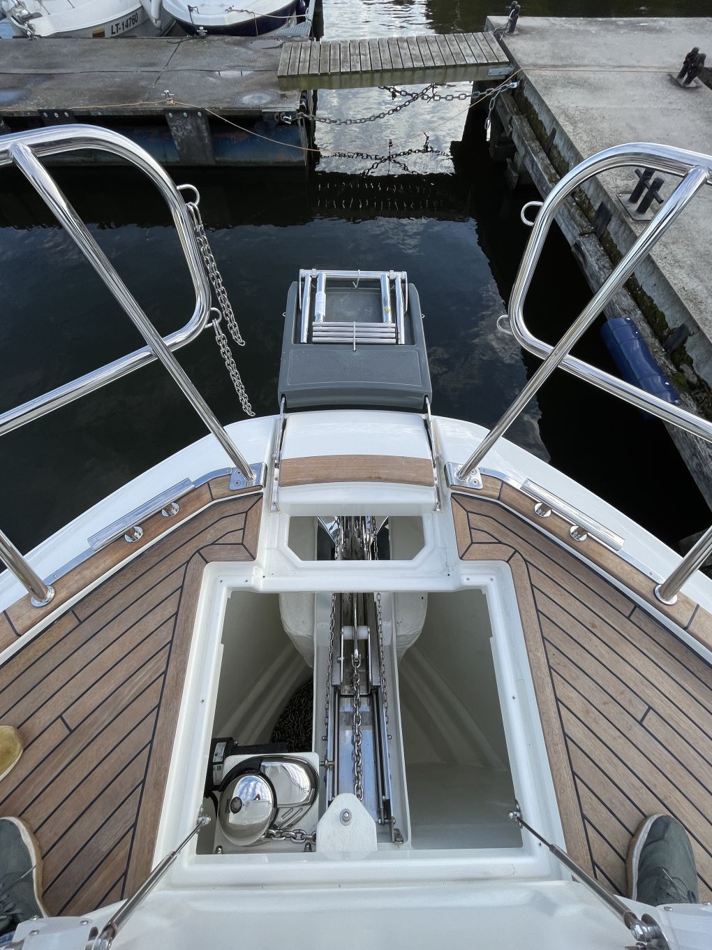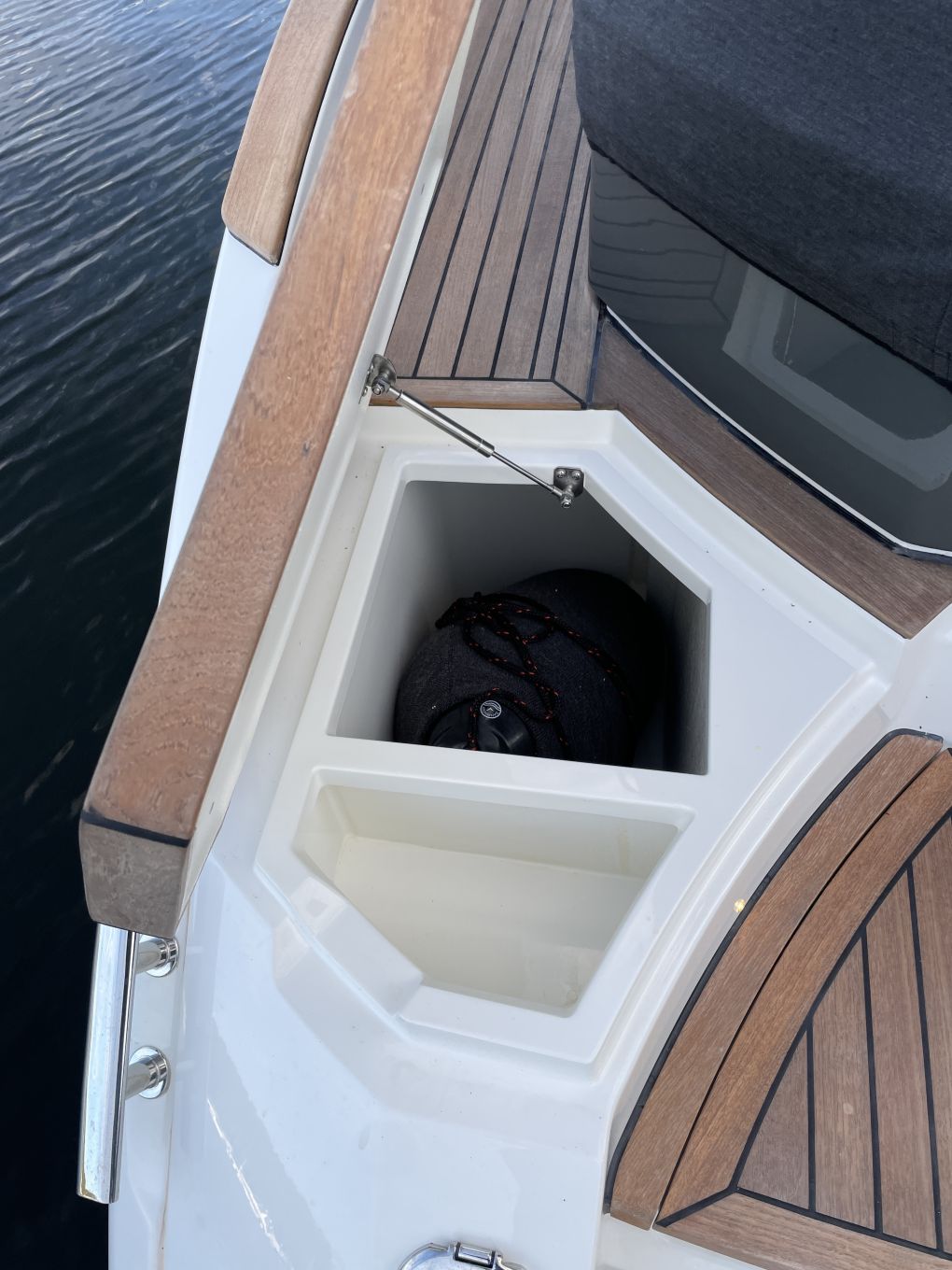 Luukun takaa esiin työntyvä keula-ankkuri on varsin arvokas, mutta hienosti toimiva ratkaisu. Kameralla varustettuna sen toimintaa ja ankkurin pohjaan putoamista ja paikkansa löytämistä voi seurata ohjaamosta käsin monitoiminäytön ruudulta.