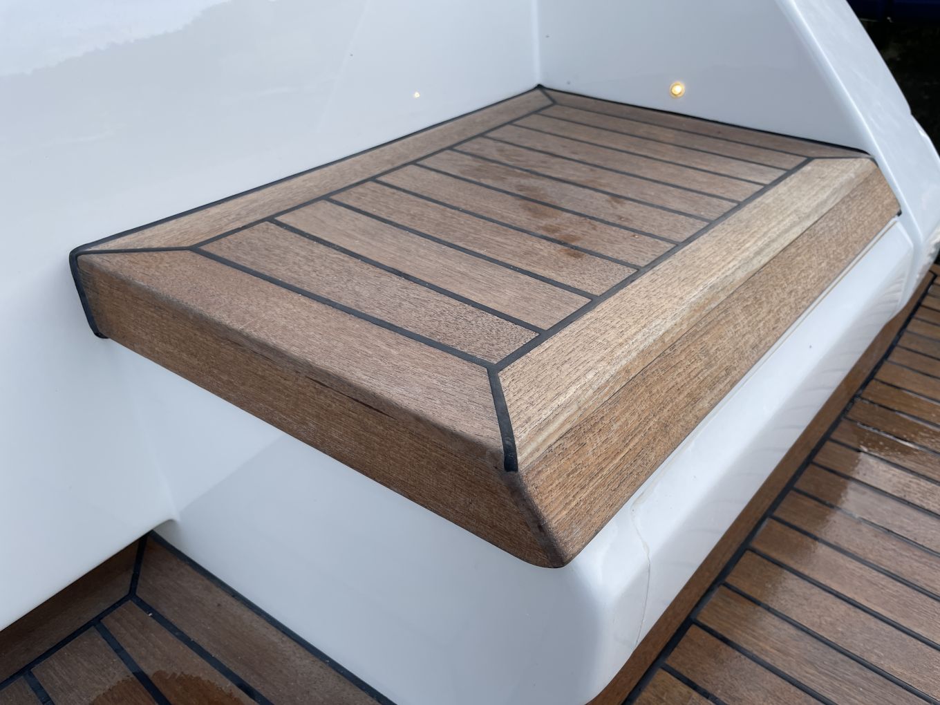 Sivukannet ovat korostuneet leveät ja kaiteet sekä jykevät että korkeat. Kaiteissa on sekä keulassa että sivuilla kettingillä suljettavat portit helpottamassa maihinnousua. Keulakannen aurinkopatjaan liittyy mukava ominaisuus: se toimii myös kelluvana uimapatjana.