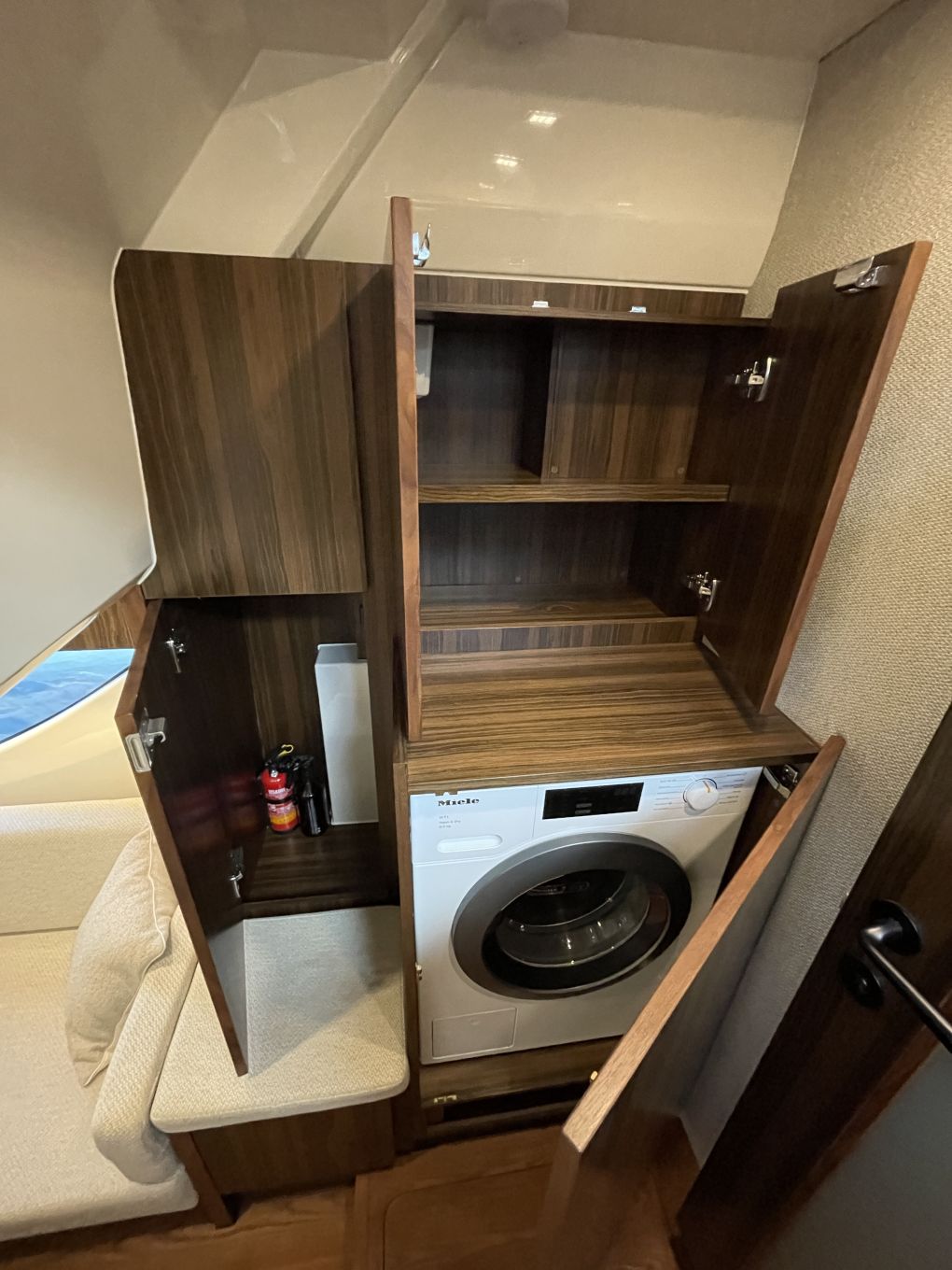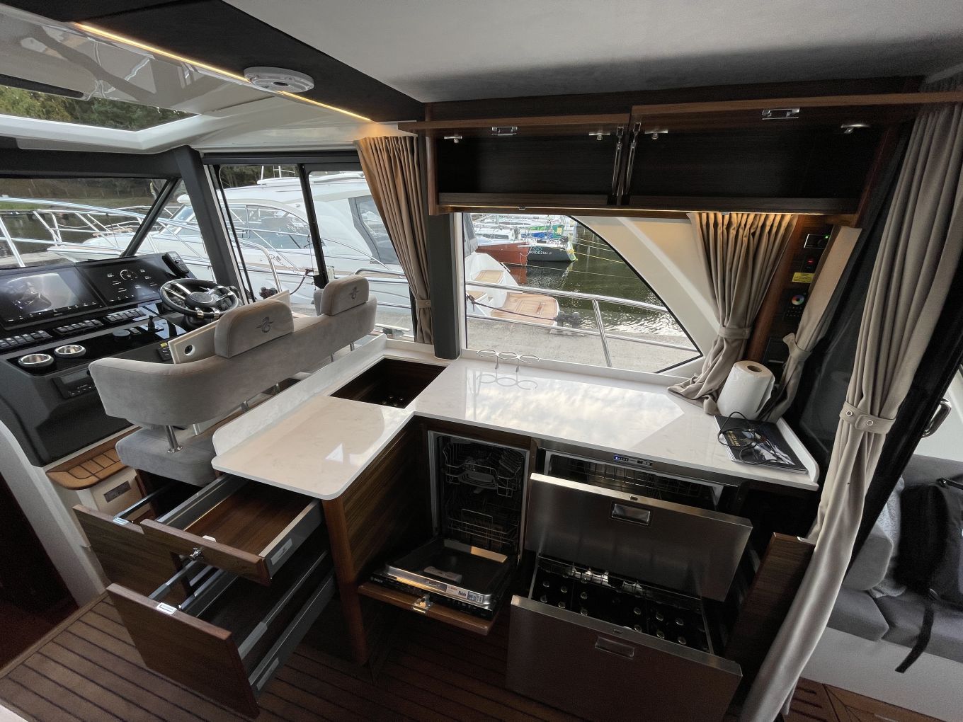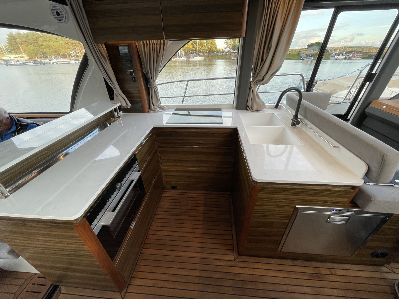 Paapuurin puoli on varattu kookkaalle U-malliselle työtasolle. Kaappitilaa sekä lasku- ja työtasoa on ruhtinaallisesti, vaikka erillinen uuni ja induktioliesitaso sekä tuplapesuallas ottavat osansa. Styyrpuurin tiski on L-mallinen, ja ladattu säilytystilojen lisäksi peräti kolmella jääkaapilla sekä astianpesukoneella. Jääkaapeista kaksi on kookkaita vetolaatikkomallisia ja yksi päältä ladattava arkku. Pakastin on vielä erikseen. Kylmäsäilytystilat eivät tästä veneestä lopu ihan heti kesken.