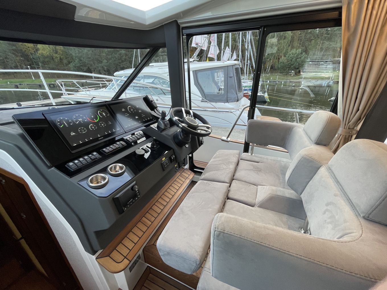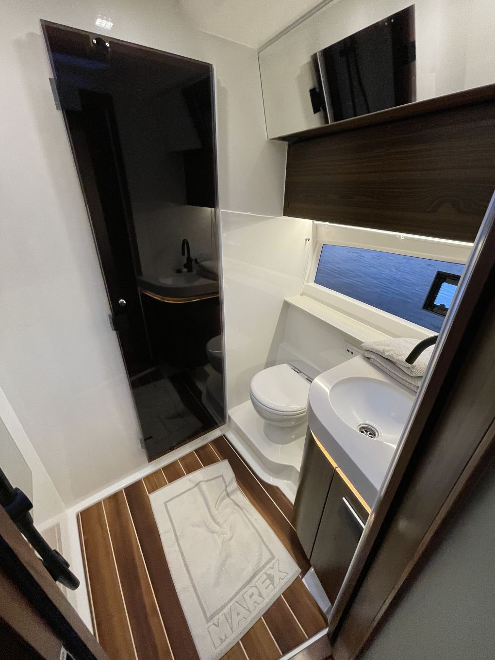 Ohjaamosta suoraan sivukannelle johtava liukuovi alkaa olla jo aika yleinen ratkaisu, mutta Marex on laittanut oven myös paapuurin laidalle, mikä parantaa kuljettavuutta entisestään. Komentosillan molemmilla laidoilla on reilun kokoiset paripenkit, joihin oikeasti mahtuu kaksi aikuistakin. Näkyvyys korotetuilta penkeiltä on moitteeton.