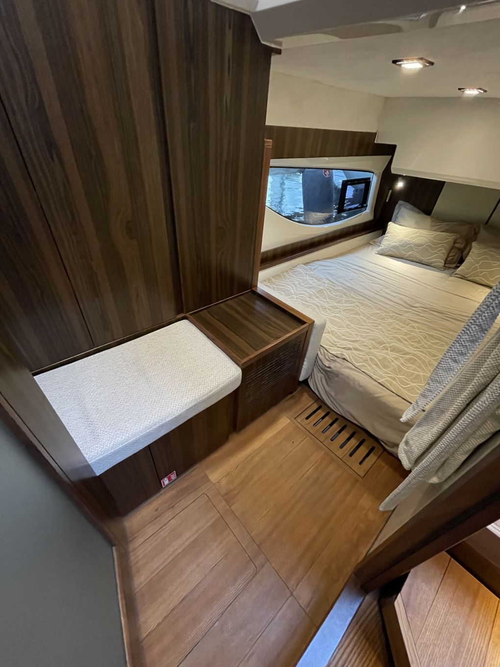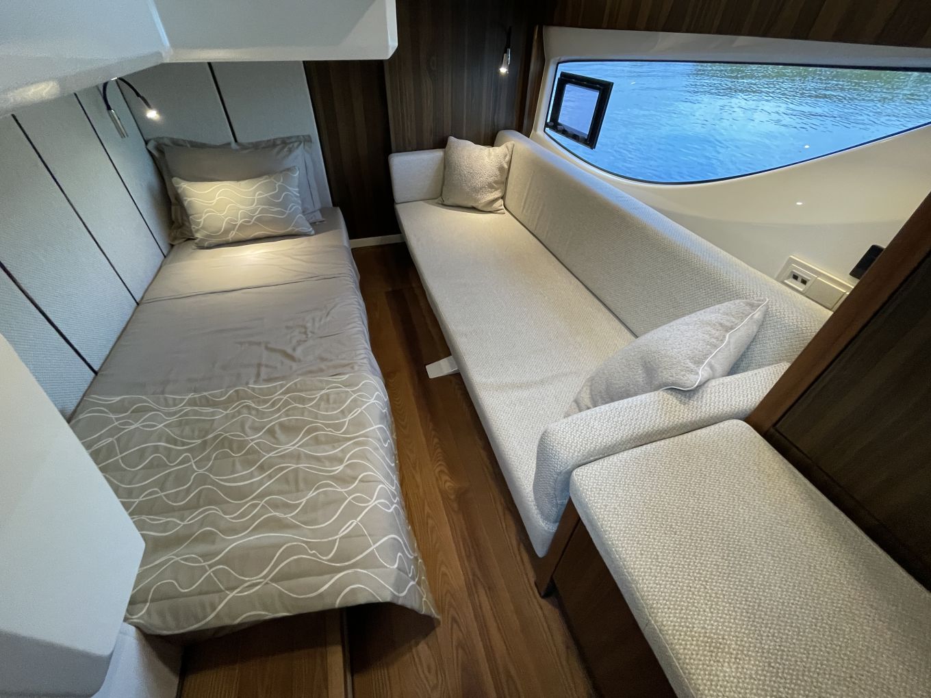 Keskiveneen makuukajuutat ovat kutakuinkin yhdenvertaiset. Koeajoveneen styyrpuurin kajuuttaan on pedattu yhtenäinen parivuode, paapuurin kajuutta näyttäytyy puolestaan vuoteella ja vuoteeksi pedattavissa olevalla sohvalla. Ajatuksena on, että paapuurin kajuutta voi toimia päiväsaikaan myös paikkana, johon voi vetäytyä omaan rauhaan olemaan, tai vaikka lapset pelaamaan.