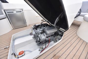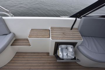 Tuttuun tapaan sohvien uumenissa on runsaasti säilytystiloja. Varsinkin keulasohvan sisään mahtuu vaikka mitä. Sohvan keulapiikki on mitoitettu siten, että sinne saa halutessa vaikka wc-istuimen. Lisävarustelistalta etusohvan keskelle saa jalallisen pöydän ja sohvan varavuoteeksi tai aurinkotasoksi täydentävät täytepatjat. Moottorikopan kansi ja laita-askelmat toimivat varsin luontevasti myös pöytä- ja laskutasoina. Lisäksi askelmien sisään on upotettu paikat esiin taittuvalle roskakorille ja lisävarusteena saatavalla jääkaapille.