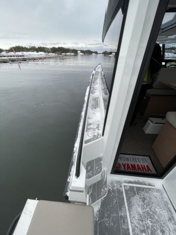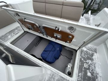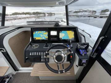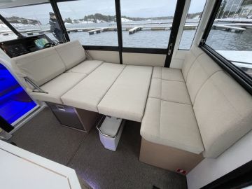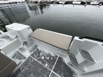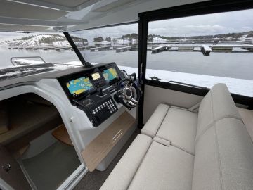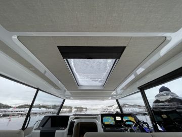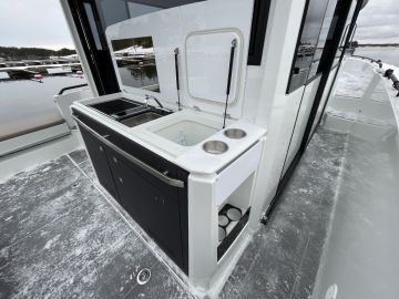 Ulkotilat ovat paljon monipuolisemmat kuin pohjoismaiselta ohjaushyttiveneeltä on perinteisesti totuttu odottamaan. Keulakannelle saa lisävarusteena mukavasti kolmen loikoiltavan divaanipatjan, jota ei tarvitse mukana tulevan suojapeitteen ansiosta käyttöä varten sen kummemmin koota ja purkaa.