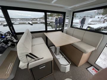 Matkustamo muuntuu oleskelutilaksi vaivatta, siihen tarvitaan vain ohjaamon peripenkin selkänojan taitto etuasentoon. Sen jälkeen ohjaamon penkistä, takasohvasta ja niiden välissä olevasta sähköisesti korkeussäädettävästä pöydästä muodostuu mukava kansisalonki, joka soveltuu niin ruokailuun kuin viileämmissä olosuhteissa oleskeluunkin.