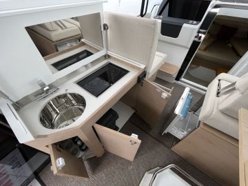 Avotilaan saa lisää kalusteita optiolistalta. Hytin takaseinää vasten voi valita toisen, perää kohti kolmen istuttavan sohvan, ja sohvien väliin täysleveän pöydän. Laitaterassit huomioiden istumapaikkoja on kenties ilman etusohvaakin riittävästi, joten sen tilalle voi ruksia koeajoyksilön tavoin pätevän ulkopentterimoduulin. Siihen kuuluu pesualtaan ja hanan, koneistetun kylmäarkun ja sähkögrillin lisäksi kaappi- ja laskutilaa sekä muki- ja pullotelineet.