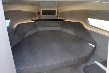 Itse asiassa Raptor kurkottaa kovasti sportcruiserien luokkaan myös sisätiloiltaan. Yöpymään mahtuu neljä. Keulan asiallisen kokoiseen parivuoteeseen kellahtaa kaksi aikuista vaivatta. Avotilan alle pitkittäin työntyvä parivuode on tiukempi tapaus. Kahdelle lapselle se on varmasti mieleinen sopukka, mutta aikuisilta vaaditaan läheistä rakkaussuhdetta, jos sekään auttaa.