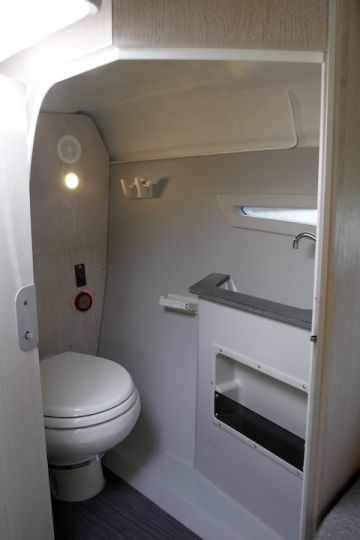 Monelle merkittävin matkavenemäisyys on kuitenkin erillinen vessa. Raptorin vessa on pienimpiä koppeja mitä veneistä löytyy, mutta ajanee silti asiansa, vaikka isommaksi kasvaneet joutuvatkin peruuttamaan sisään. Vessan huuhtelu käy kuitenkin kätevästi napista painamalla.