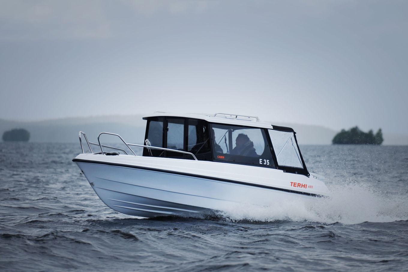 Terhi 480 on suhteellisen solakka vene, mutta paikallaan ollessa se on silti kelvollisen vakaa. Ajossa tilanne kuitenkin hieman muuttuu. Avomallien tavoin myös Cabin kulkee kuormaamattomana uppoumanopeuksilla pienveneille tyypilliseen tapaan hiukan kuskin puolelle kallellaan.