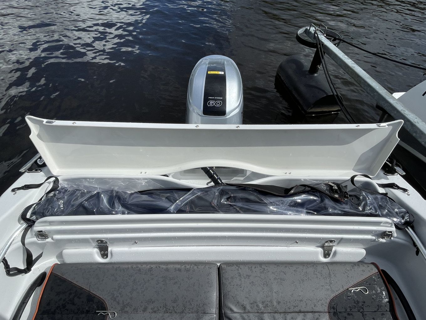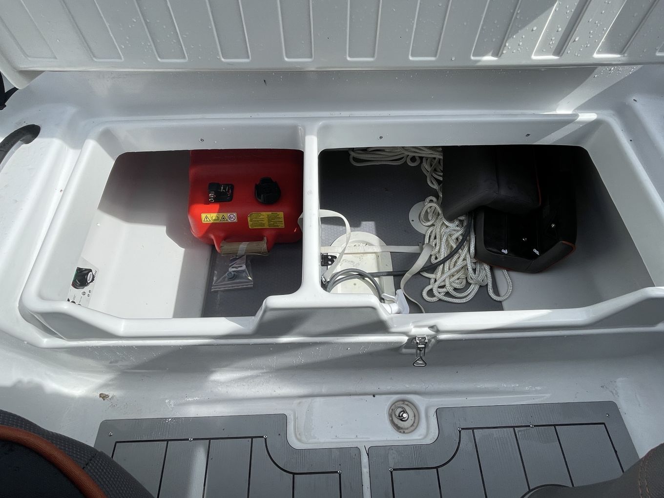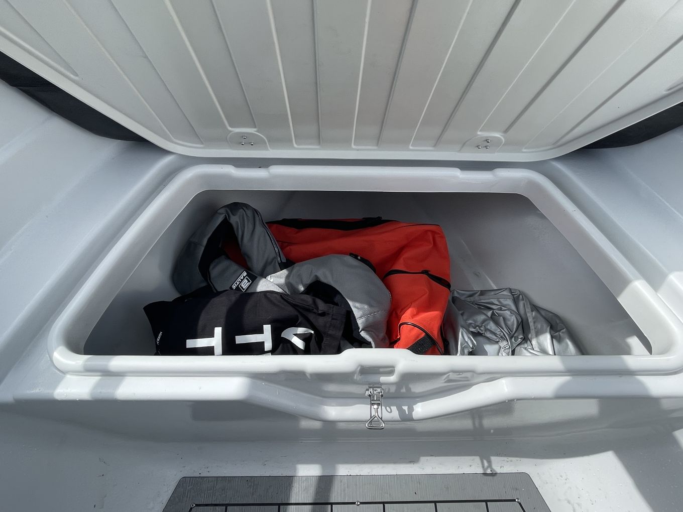 Takapenkin alla on tuttuun tapaan tavaratila. Luukun avaaminen ja sulkeminen sekä tavaroiden tai polttoainekanisterien liikuttelu on tilan puutteen takia paikoin haastavaa, vaikka vene olisi miehistöstä tyhjä. Avomalliin verrattuna Cabinin hytin takareunat tiivistävät tunnelmaa.