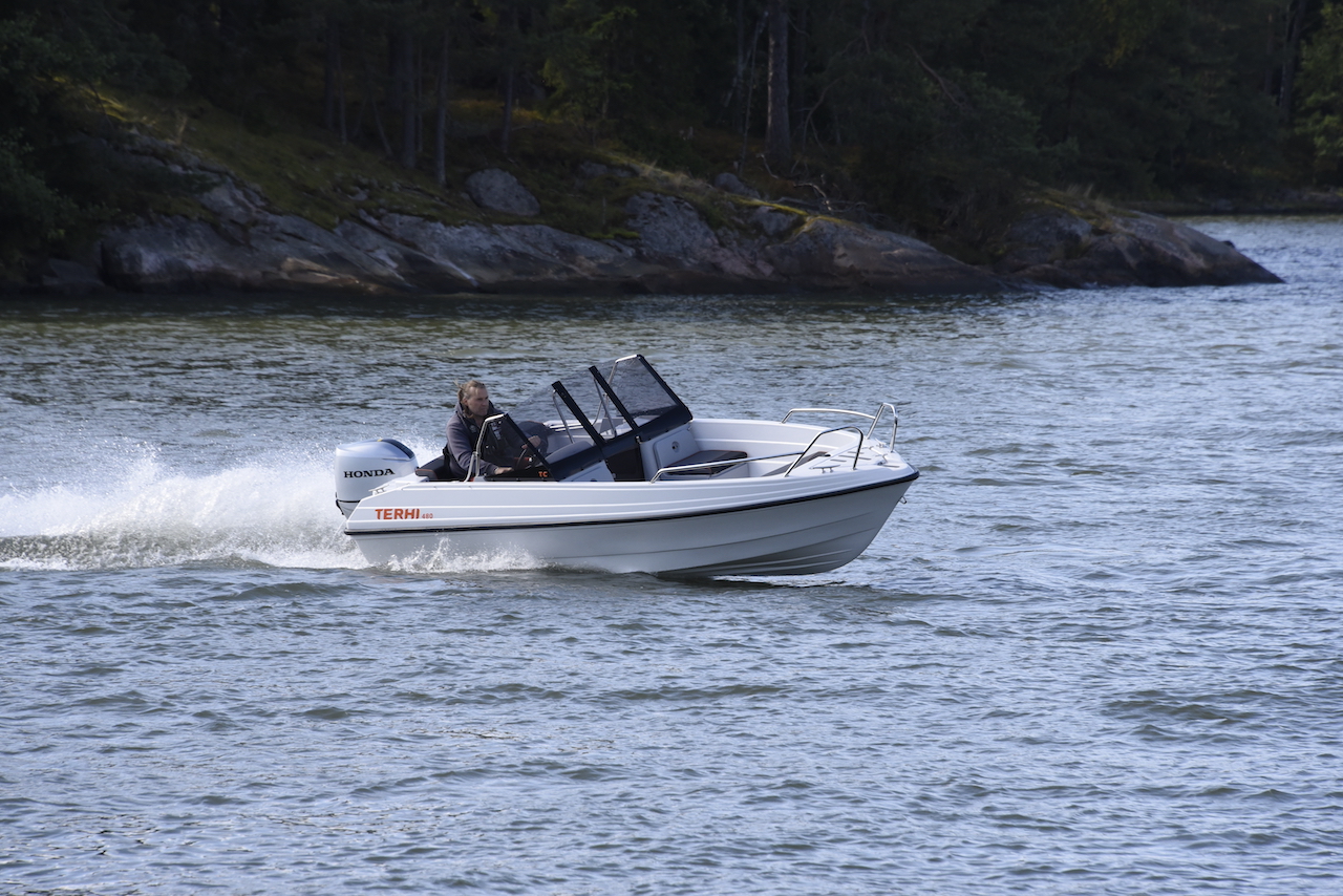 Tehovaihtoehtoja on kolme, 40-, 50- ja 60-hevosvoimaa. Peräpeiliin ripustetaan sekä Suzukin että Hondan koneita. Koeajoveneen 60-hevosvoimaine Honda nosti huippunopeuden vaivatta yli 32 solmuun. Varsinaisia kulutusmittauksia ei tehty, mutta reilun 20 solmun liukunopeudelle se ei paljoa puolesta litrasta meripeninkulmalla heitä. Paketin hankintahinta jää edukkaasti alle 15 000 euroon, tosin esimerkiksi kaiteet ja kulkuvalot ovat Terhissä pienvenemäisesti lisävarusteita.